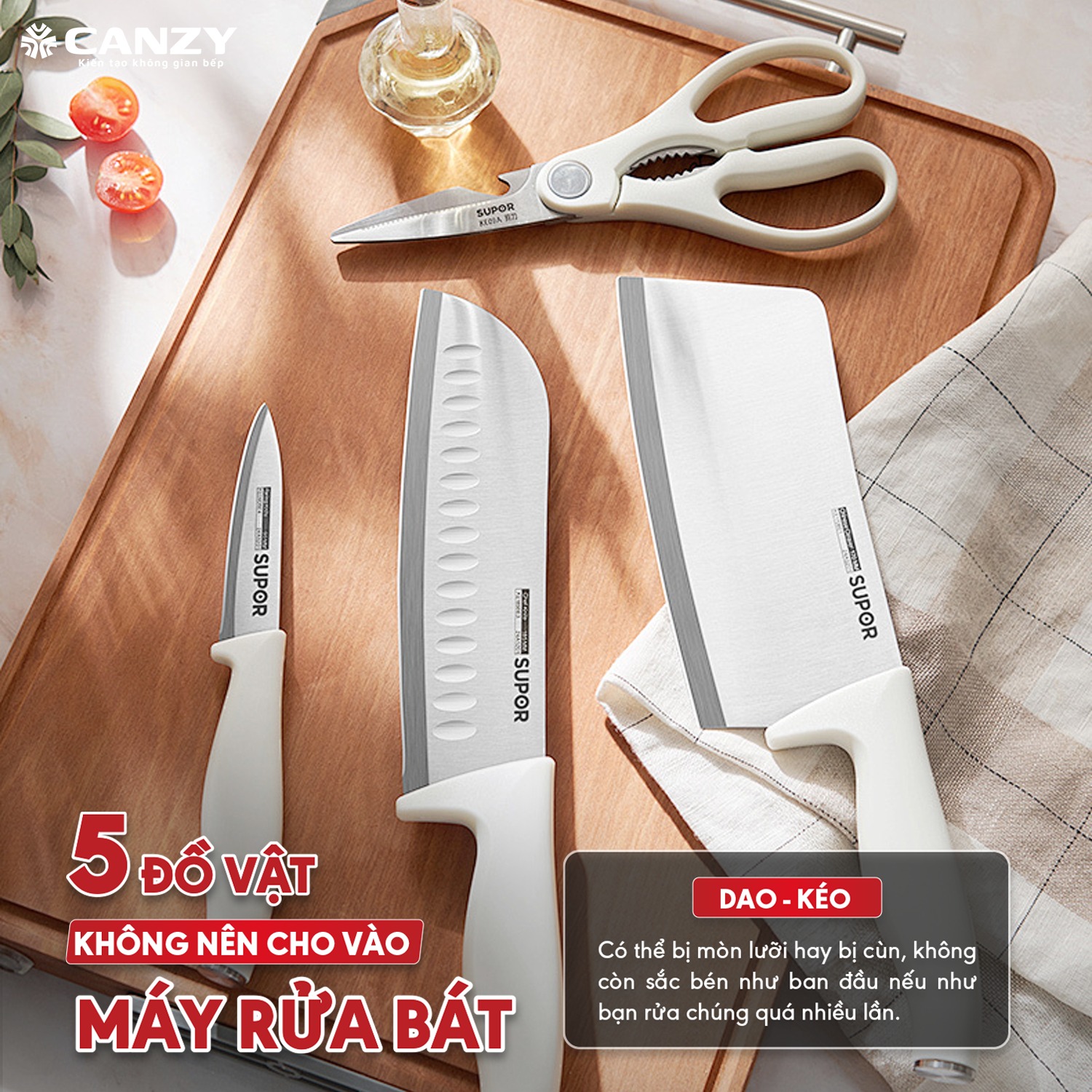 👉 Dao, kéo nên được rửa bằng tay để giữ độ bén và đảm bảo an toàn.