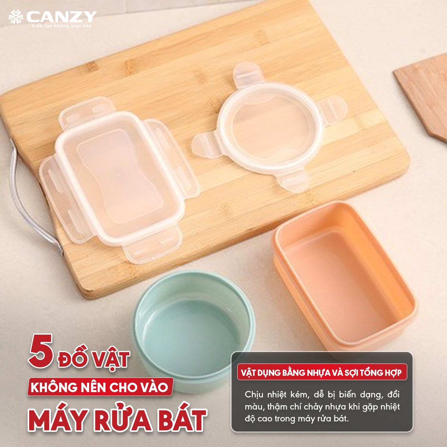 👉 Chỉ dùng nhựa có ký hiệu “Dishwasher Safe / Heat Resistant”, còn lại nên rửa bằng tay.