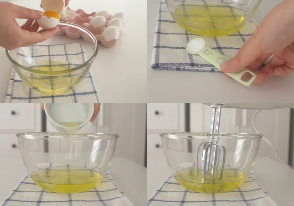 Thêm ⅓ muỗng cà phê muối vào tô lòng trắng trứng, sau đó dùng máy đánh trứng đánh ở tốc độ trung bình trong khoảng 20 giây đến khi xuất hiện bọt khí lớn.