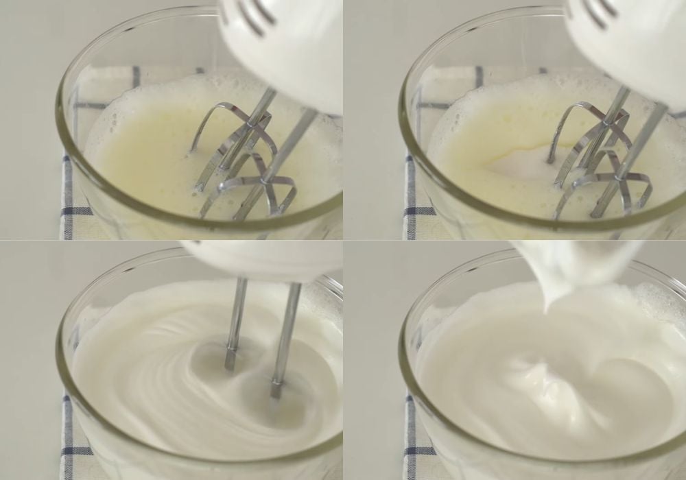 Khi bọt khí trở nên nhỏ mịn, bắt đầu cho đường từ từ (3–4 lần), vừa cho vừa đánh đến khi hỗn hợp trắng mịn, tạo chóp đứng, không bị chảy là đạt chuẩn.