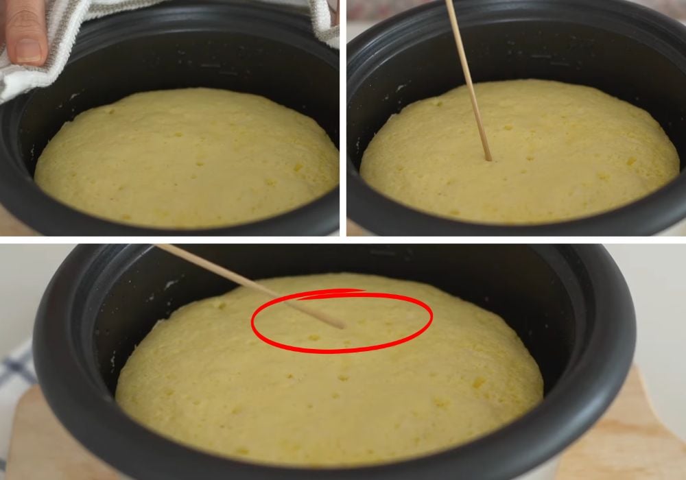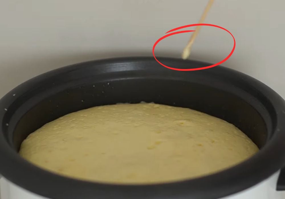 Nếu rút ra que khô, không dính bột nghĩa là bánh đã chín. Nếu còn ướt, tiếp tục bật lại chế độ nấu thêm 10–15 phút.